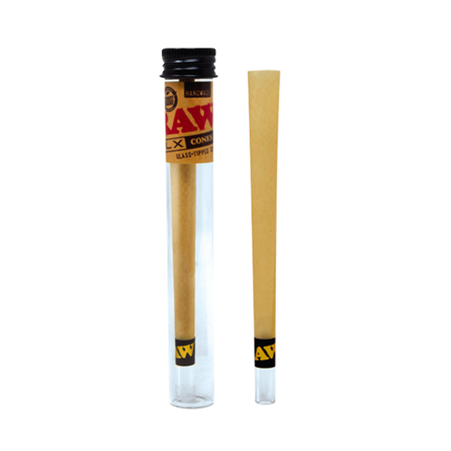 Each RAW x DLX glass cone is artisan rolled using genuine RAW paper from Spain around a premium, heat-resistant glass tip. Each tube contains x1 King Size cone.