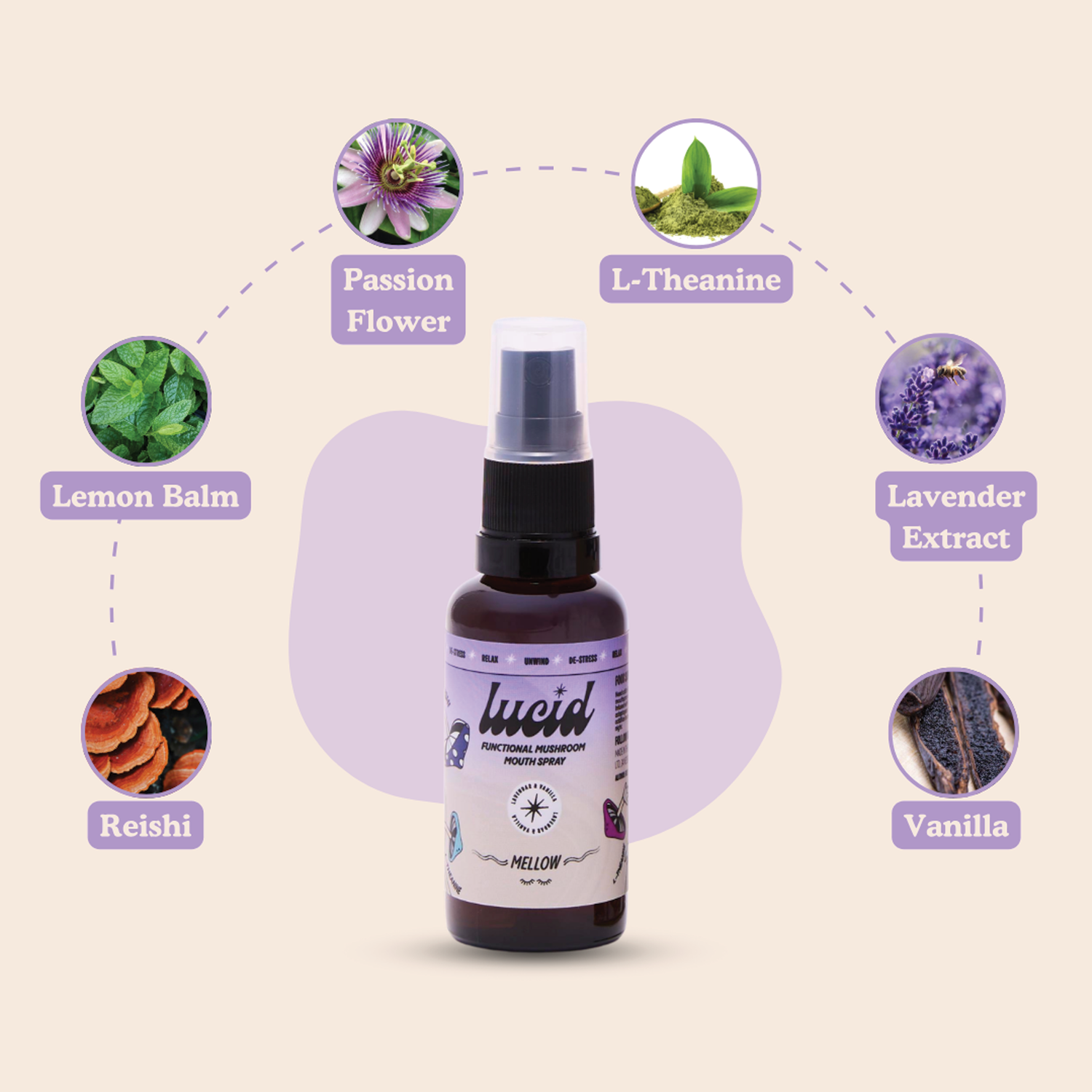 Ingredients: Glycerine, Aqua, Reishi, Passion Flower, Lemon Balm, L-Theanine, Lavender & Vanilla.