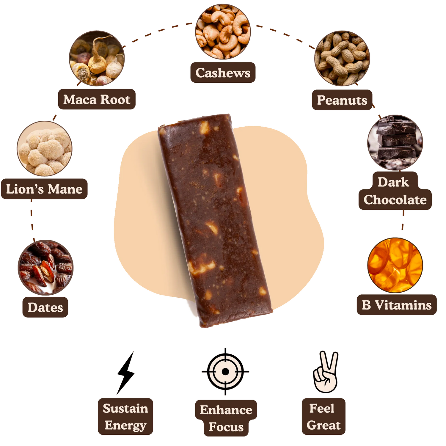 Ingredients: Dates, Peanuts, Cashews, Chicory Fibre, Rice Protein, Organic Dark Chocolate (Cocoa, Sugar, Cocoa Butter, Vanilla Powder), Organic Maca, Organic Lion's Mane, Natural Flavouring, Salt, Rice Flour, Vitamins (B5, B6, B12).