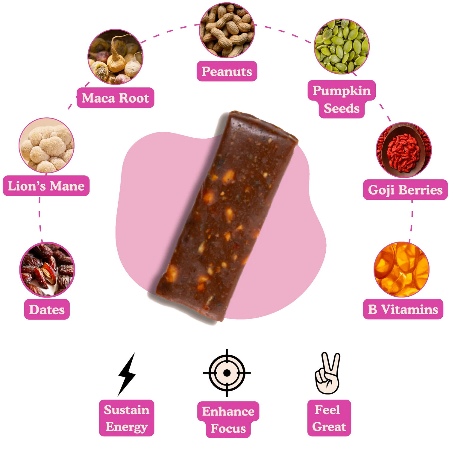 Ingredients: Dates, Peanuts, Chicory Fibre, Rice Protein, Pumpkin Seeds, Organic Maca, Goji Berries, Organic Lion's Mane, Freeze Dried Raspberries, Salt, Natural Flavouring, Rice Flour, B5, B6, B12.